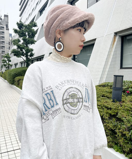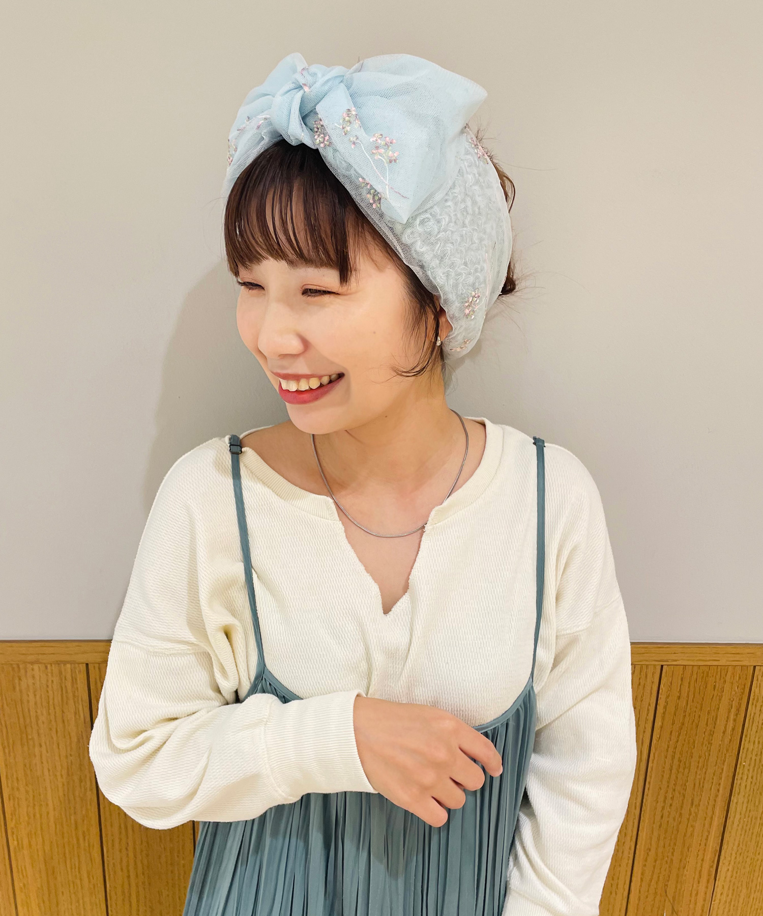 キュートタイプの顔立ちに合わせた素材感とカラーリングのコーディネートです。柔らかくてボリューム感のあるヘアバンドに合わせて全体のカラーもパステル系で統一して、ナチュラルでガーリーな雰囲気に仕上げました。