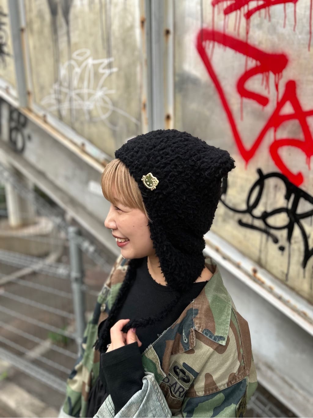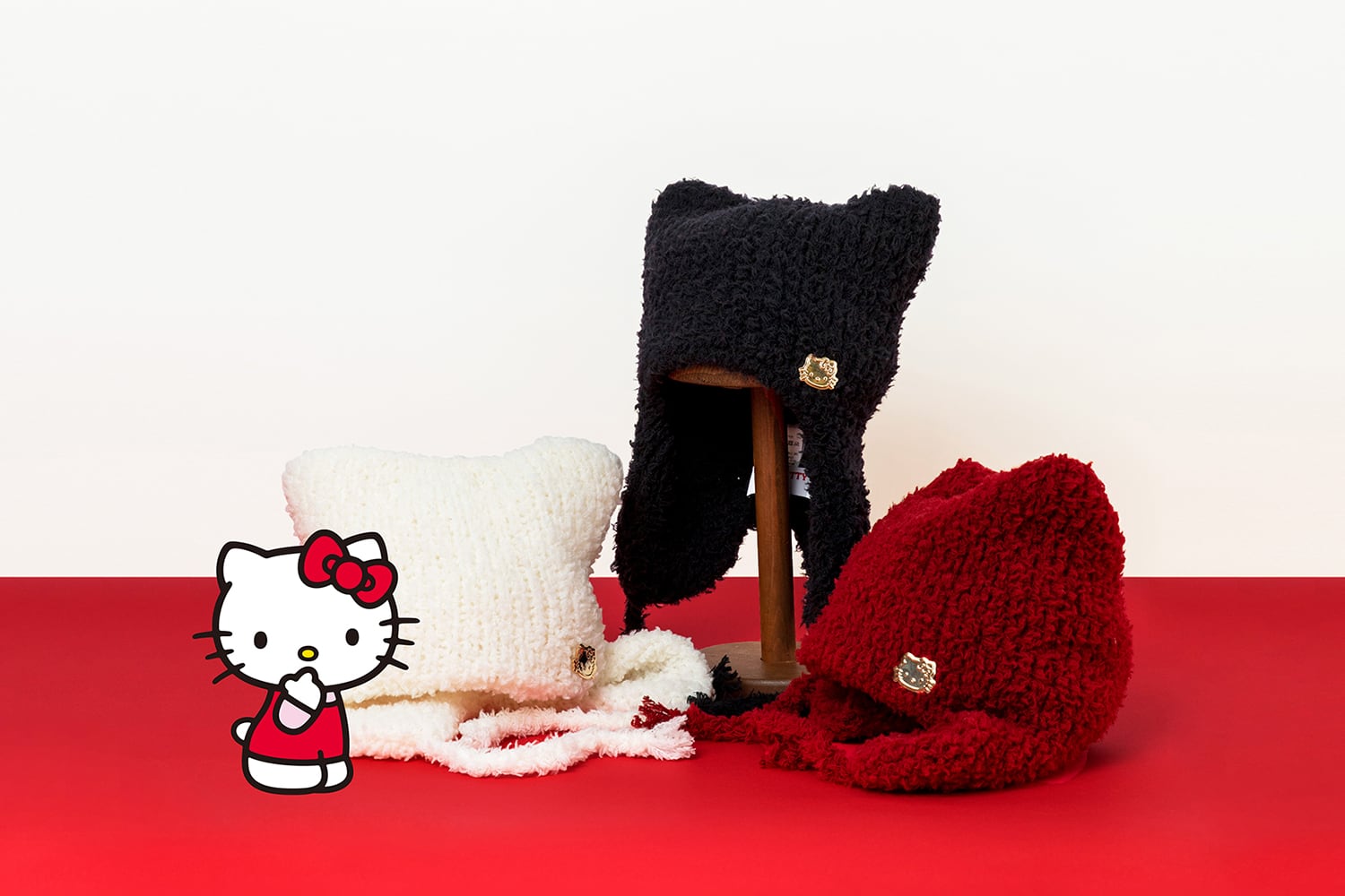 トレンドの猫耳ニットキャップを、ハローキティをモチーフにアレンジ。もこもこしたモール調の糸でボリューミーに仕上げた耳当て付きのデザインで、冬のコーディネートの主役にぴったり!
