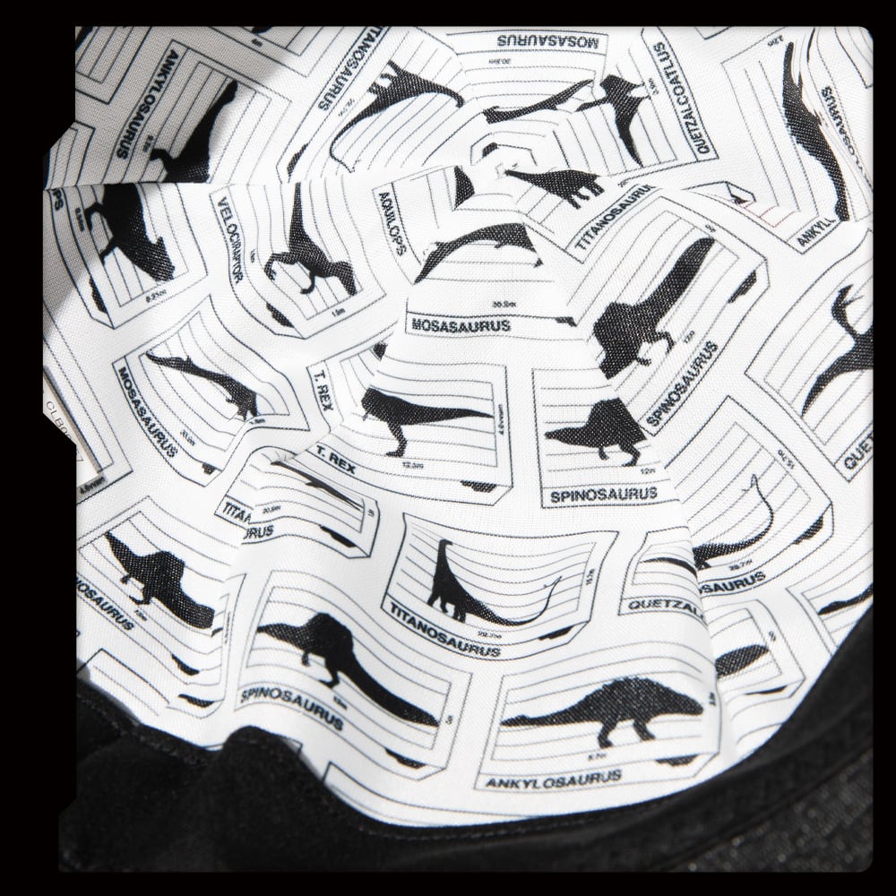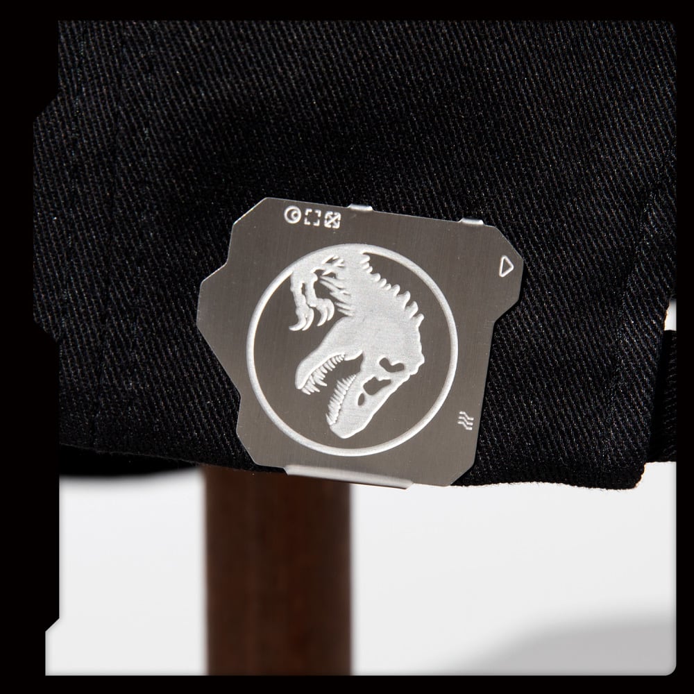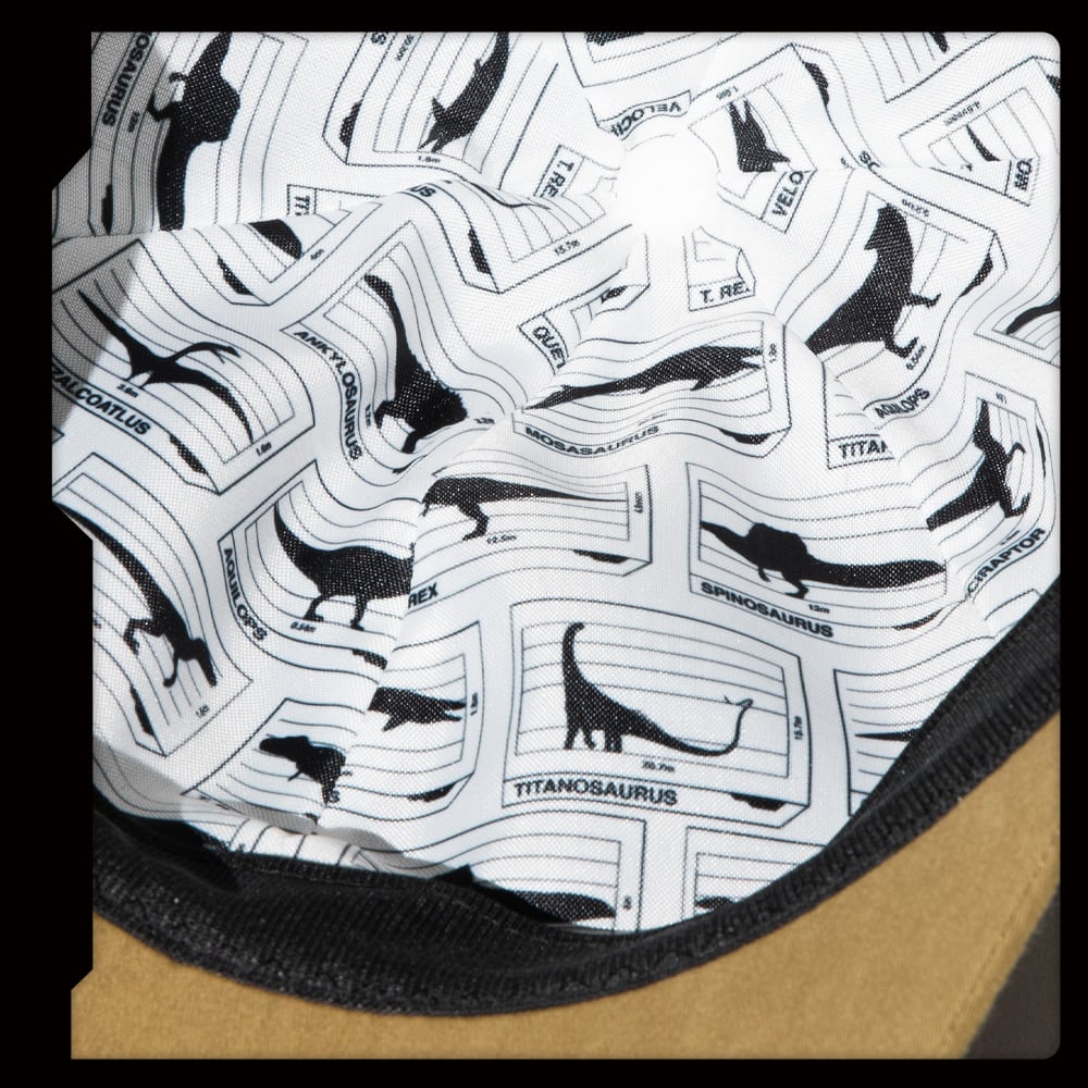 スカーレット・ヨハンソン演じるゾーラが、劇中でかぶっているキャップをモチーフにデザイン。表地にはピグメント加工を施したミリタリーテイストの生地を、裏地には恐竜のシルエットをプリントした総柄生地を使用しています。ストーリーのキーとなる「陸・海・空」の「陸」をイメージしてデザインされたアイコンのワンポイント刺繍と、シリーズを通してのアイコンであるT-レックスのロゴマークを刻印したステンレスパーツで、作品の世界観をソリッドに落とし込んだアイテムです。