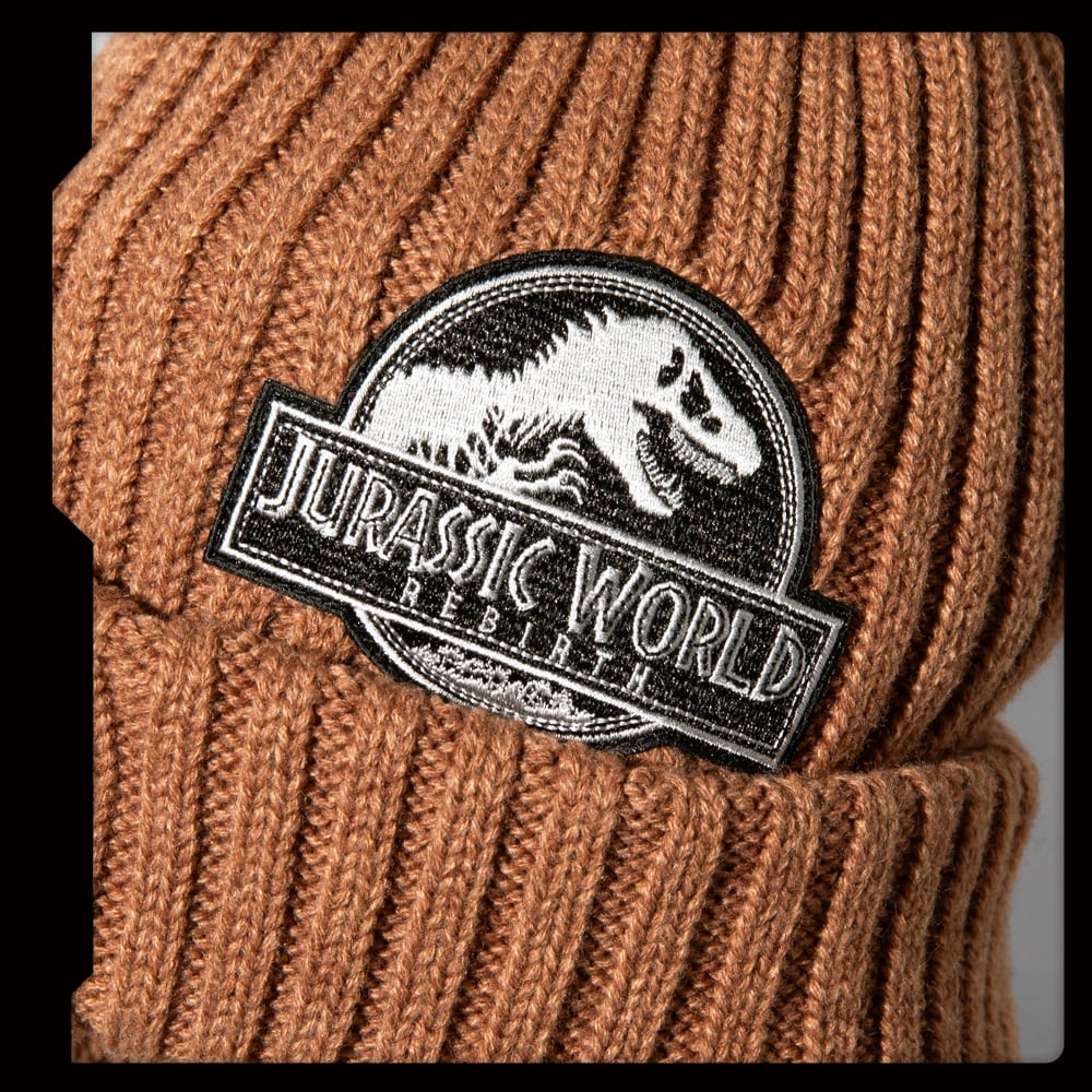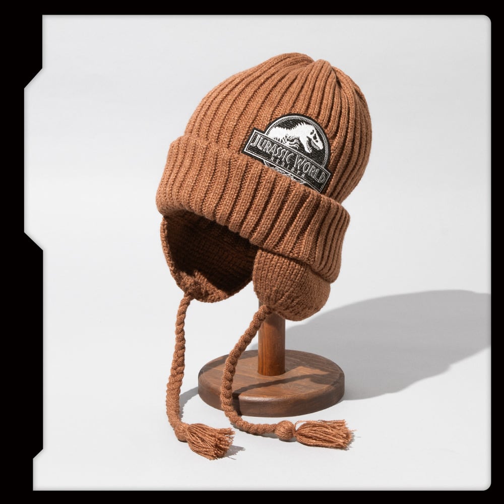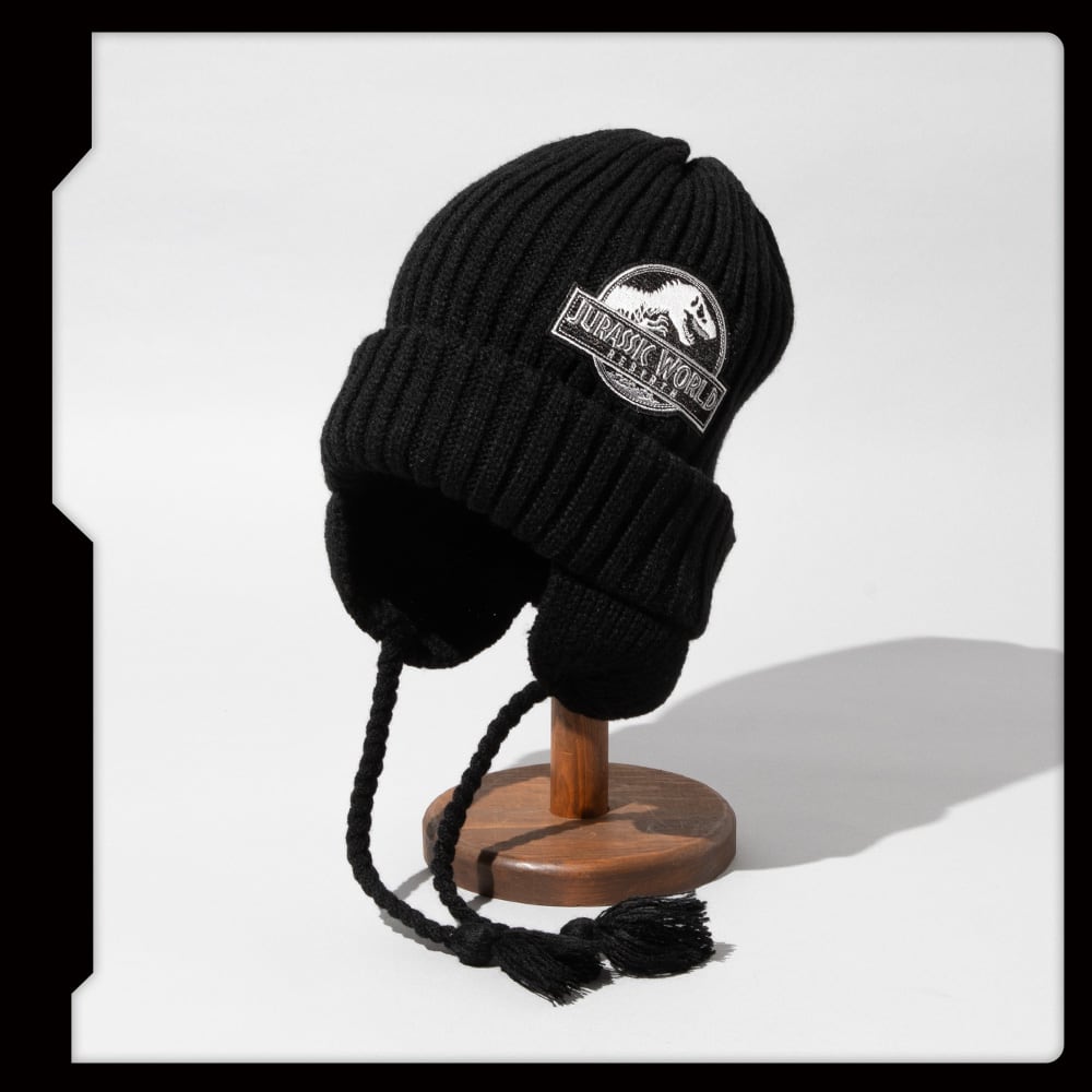 『ジュラシック・ワールド/復活の大地』のロゴワッペンがポイントの耳付きニットキャップ。フライトキャップの様なミリタリーテイストのシルエットに編み上げつつ、ニットならではの柔らかさで普段使いのしやすいデザインに仕上げています。シリーズを通してのアイコンであるT-レックスのロゴマークを刻印したステンレスパーツ付き。