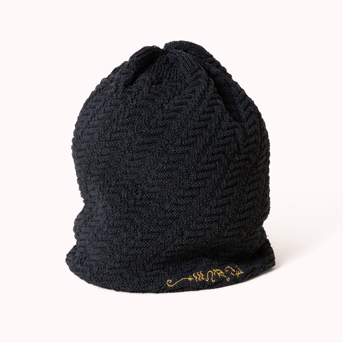 らせん状に編み立てることで、エルファバが劇中でかぶっている帽子の立体感を表現したニットキャップ。魔法の本「グリムリー」の文字で「WICKED」と書かれた刺繍がワンポイント。