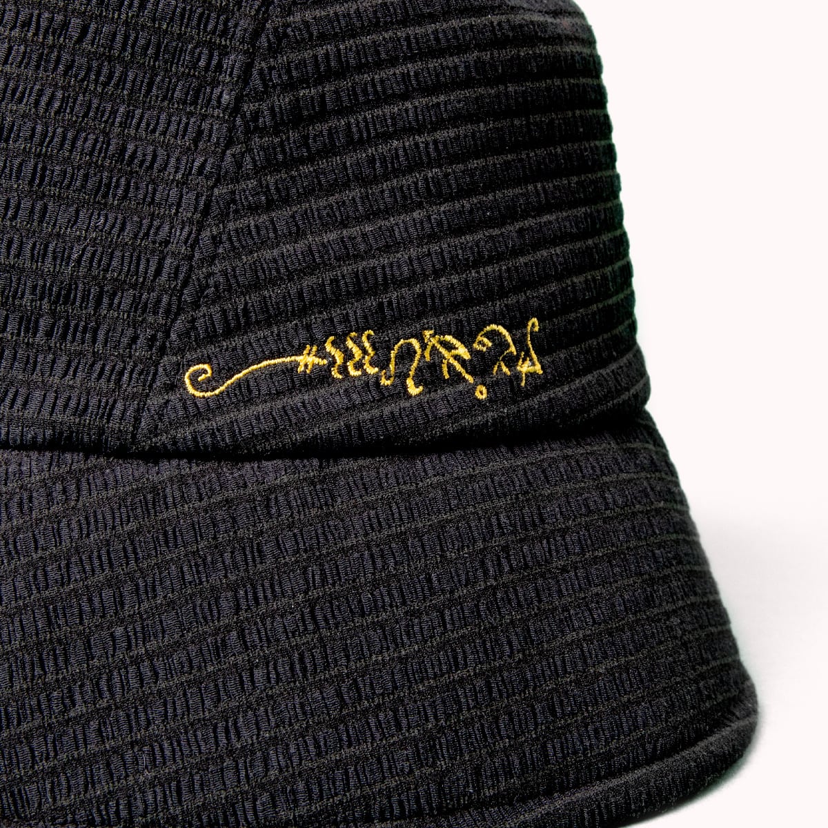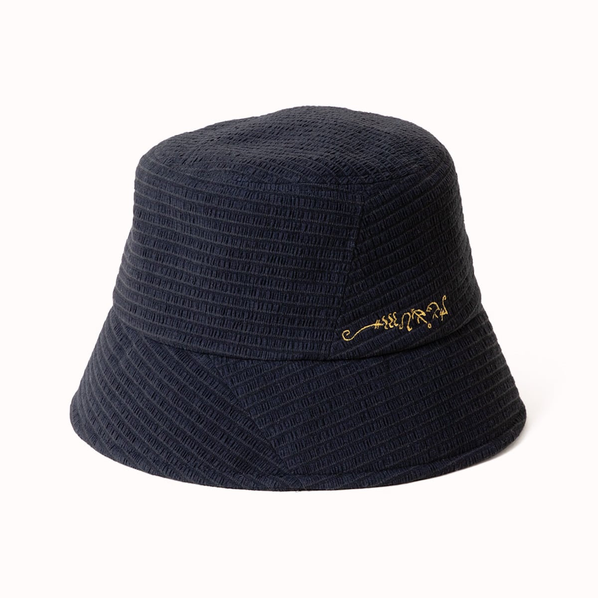 凹凸のあるテクスチャーと斜めに入れた切り替えで、エルファバが劇中でかぶっている帽子の立体感を表現したバケットハット。魔法の本「グリムリー」の文字で「WICKED」と書かれた刺繍がワンポイント。