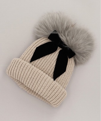 折り返しニットにフォックスファーのポンポンを2つ飾り付け。ねずみの耳のようなシルエットでキュートな印象に。