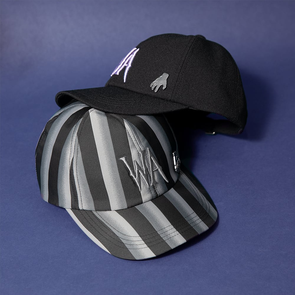 ウェンズデー・アダムスのイニシャルロゴを3D刺繍で立体的に表現したキャップ。ロゴのインパクトが映えるシンプルなブラックと、ウェンズデーの通うネヴァーモア学園の制服をイメージしたストライプ柄の2色をご用意しています。