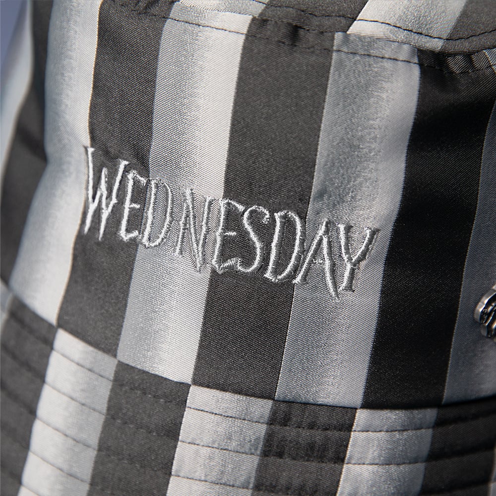 作品ロゴを3D刺繍で立体的に表現したバケットハット。ロゴのインパクトが映えるシンプルなブラックと、作中で登場するウェンズデーの通うネヴァーモア学園の制服をイメージした、ストライプ柄の2色をご用意しています。
