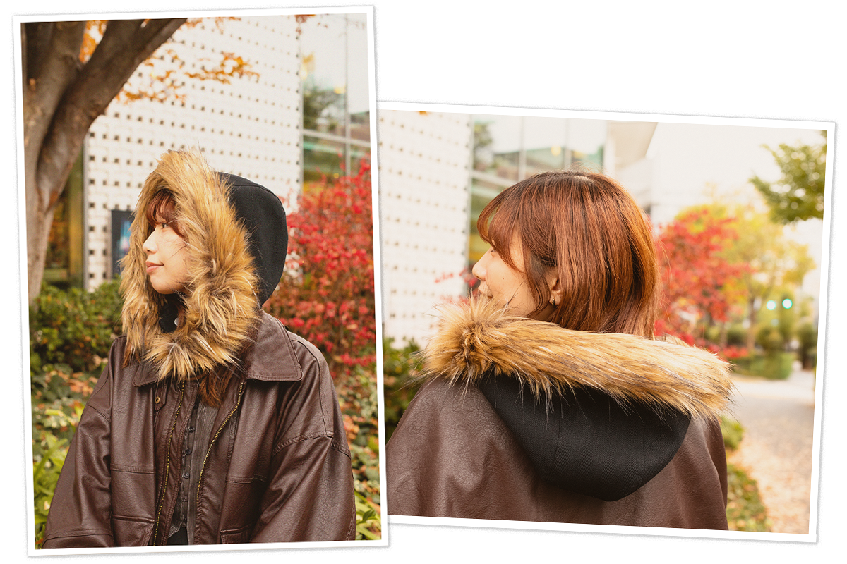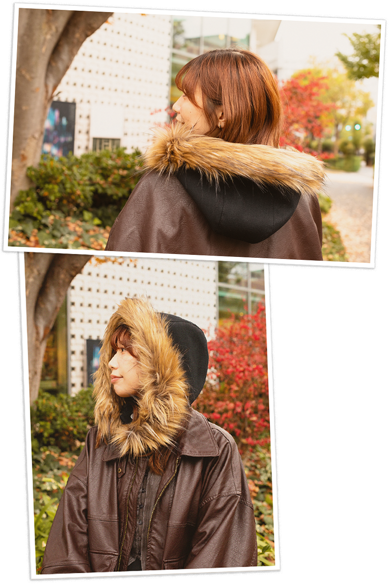 さっとかぶるだけで首元まで防寒できるフード。着脱が簡単で、アウターとの組み合わせ次第でさまざまなスタイルが楽しめます。ちょっとそこまでの外出にも。