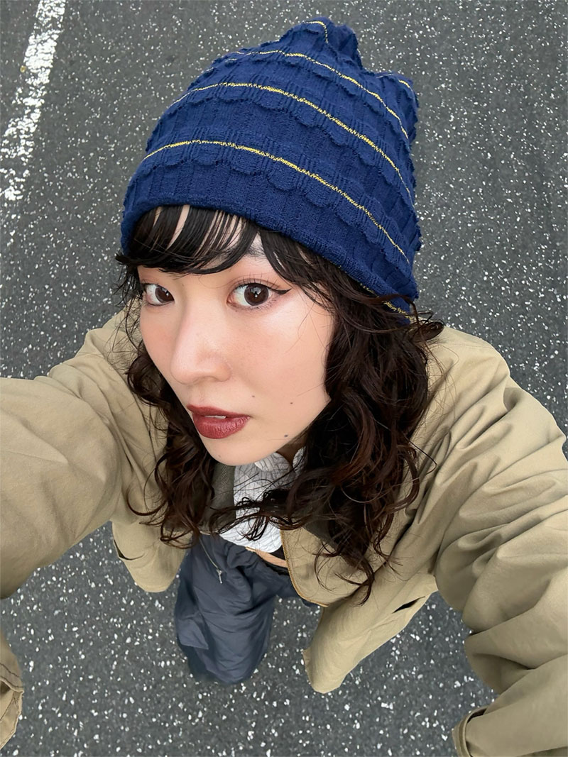 目元が際立つ、今っぽい深めのかぶり方。前髪をしまってすっきりさせるだけで、クールな印象に仕上がります。