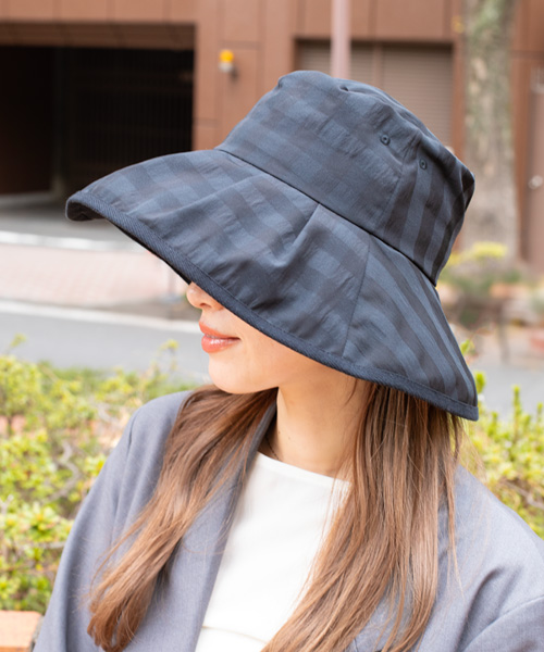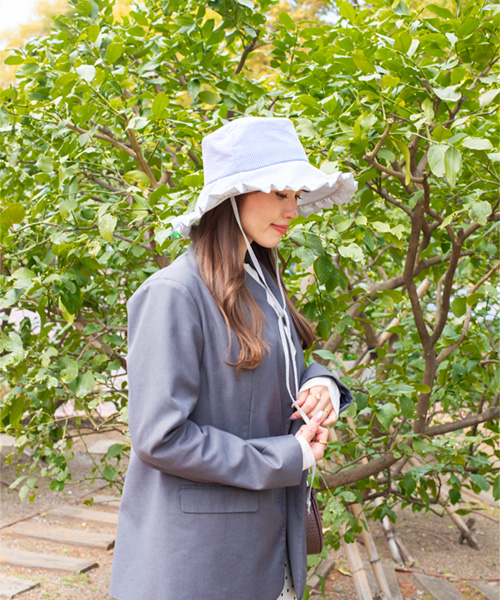 遮光、遮熱に加え、UVカット率99.9%の高い機能性を備えたハット。さらっと軽やかな風合いのサッカー生地を使用しており、ギンガムチェックがコーディネートのアクセントに。