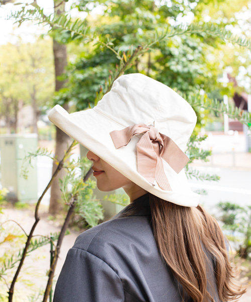 「洗える・たためる・UVカット」 の実用性と、デザイン性を兼ね揃えた、CA4LAのロングセラーアイテム。洗いをかけたコットン100%の素材感と、サイズ調節ができるサイドのリボンで、カジュアルからきれいめまで幅広いスタイルになじみます。