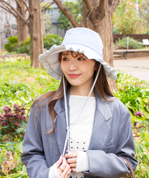 つば先にあしらったフリルが印象的なハット。UVカット率95%以上の芯地を使用したロングブリムで、長時間のお出かけにも安心です。速乾性と接触冷感の機能も備えた、春夏にぴったりのアイテム。