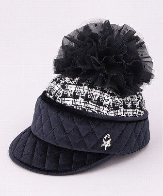 トップにチュールのポンポン、サイドにはパーツを飾り付け。カジュアルなキャップを上品なデザインに仕上げました。