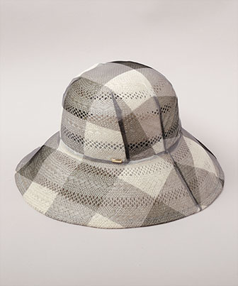 シンプルなハットにチェック柄のチュールを纏わせて、見た目にも爽やかなデザインに。サイドにはゴールドのパーツを飾り、アクセントをプラスしました。