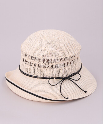 ブリムはブレード編みで日差しをブロック、クラウンは風通しの良いコマ編みで蒸れを防ぐ快適なかぶり心地です。腰には紐を飾りアクセントをプラスしました。