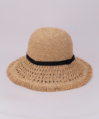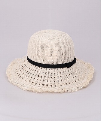 レース編み×フリンジで仕上げた、長めのブリムが特徴的。腰部分には細めのリボンを巻き、アクセントをプラスしました。