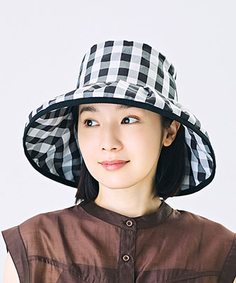 フラットなクラウンに下向きのワイドブリムを組み合わせ。日焼けしやすい首元までしっかり覆ってくれます。