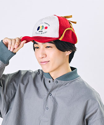 オリジナルの刺繍がポイントのデザイン。スエード調のあご紐とパイピングは、全体を引き締めるさり気ないアクセントに。ユニセックスでお使いいただけます。