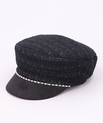 クラウンとブリムを異素材で切り替えたデザイン。フロントのパールチェーンが上品な雰囲気を醸し出します。