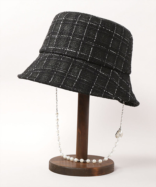 チンストラップやネックレスとしてもお使いいただける、チャーム付きのパールチェーンをあしらい、シルバーのラメを織り込んだツィード生地にはUVカットの機能をプラス。3WAYでお楽しみいただけるデザイン性と機能性を併せ持つ、特別仕様のアイテムです。
