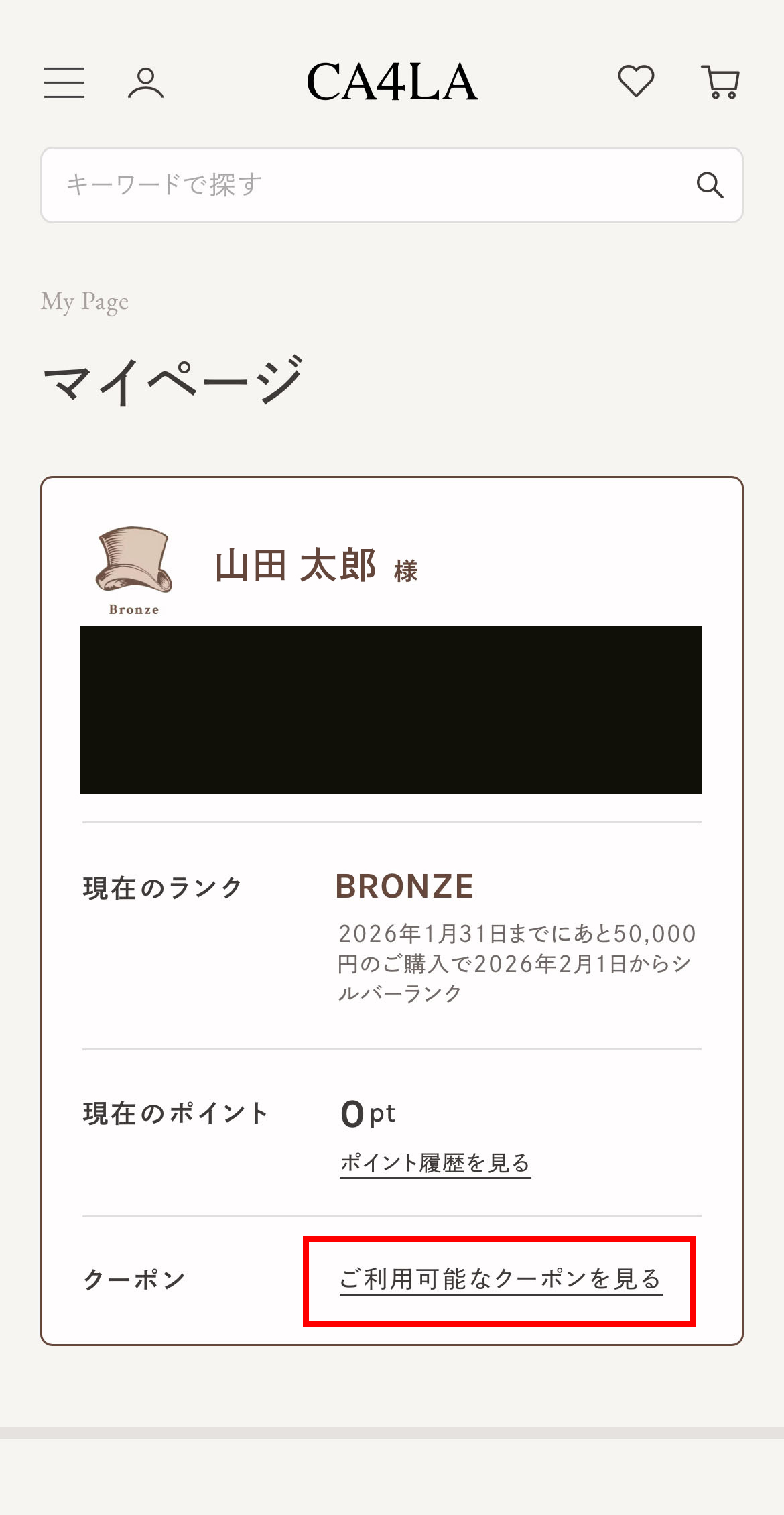 マイページ内の「ご利用可能なクーポンを見る」にクーポンコードが表示されます。