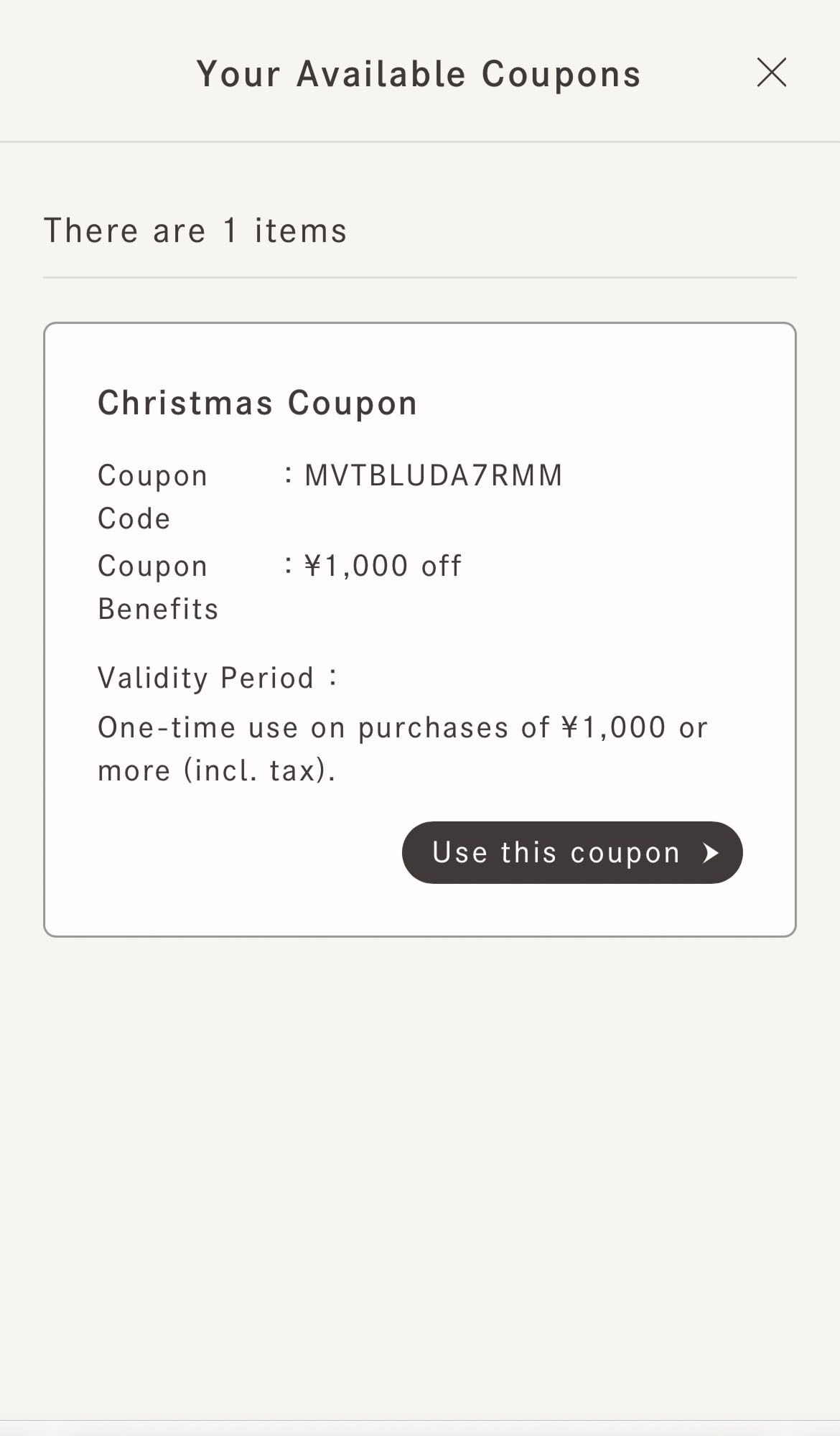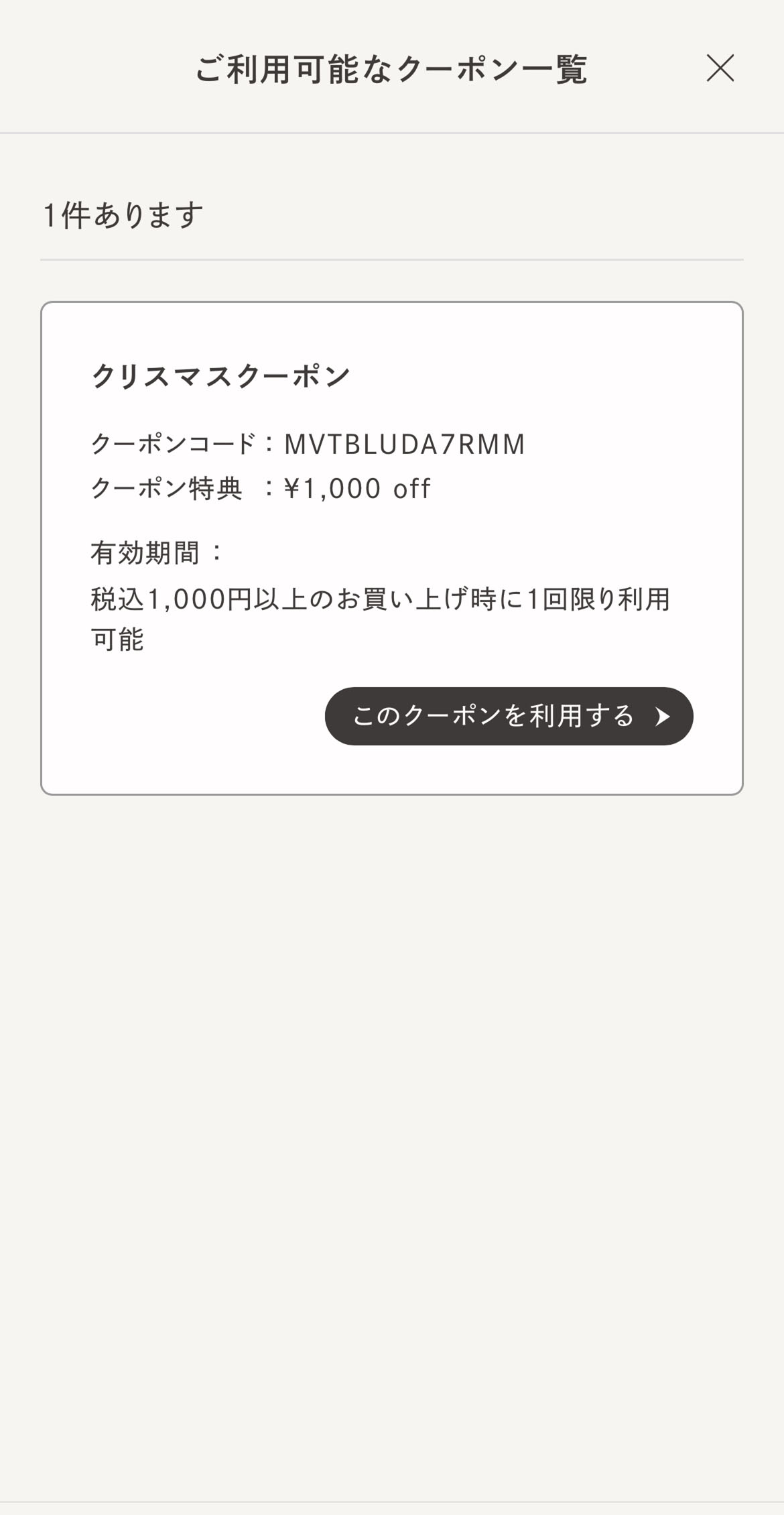 マイページの「ご利用可能なクーポンを見る」から、クリスマスクーポンのバーコードをお会計時にスタッフへご提示ください。
