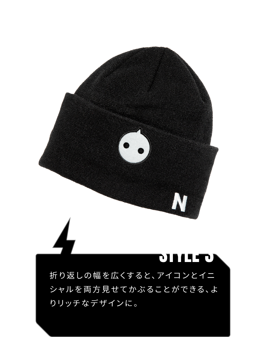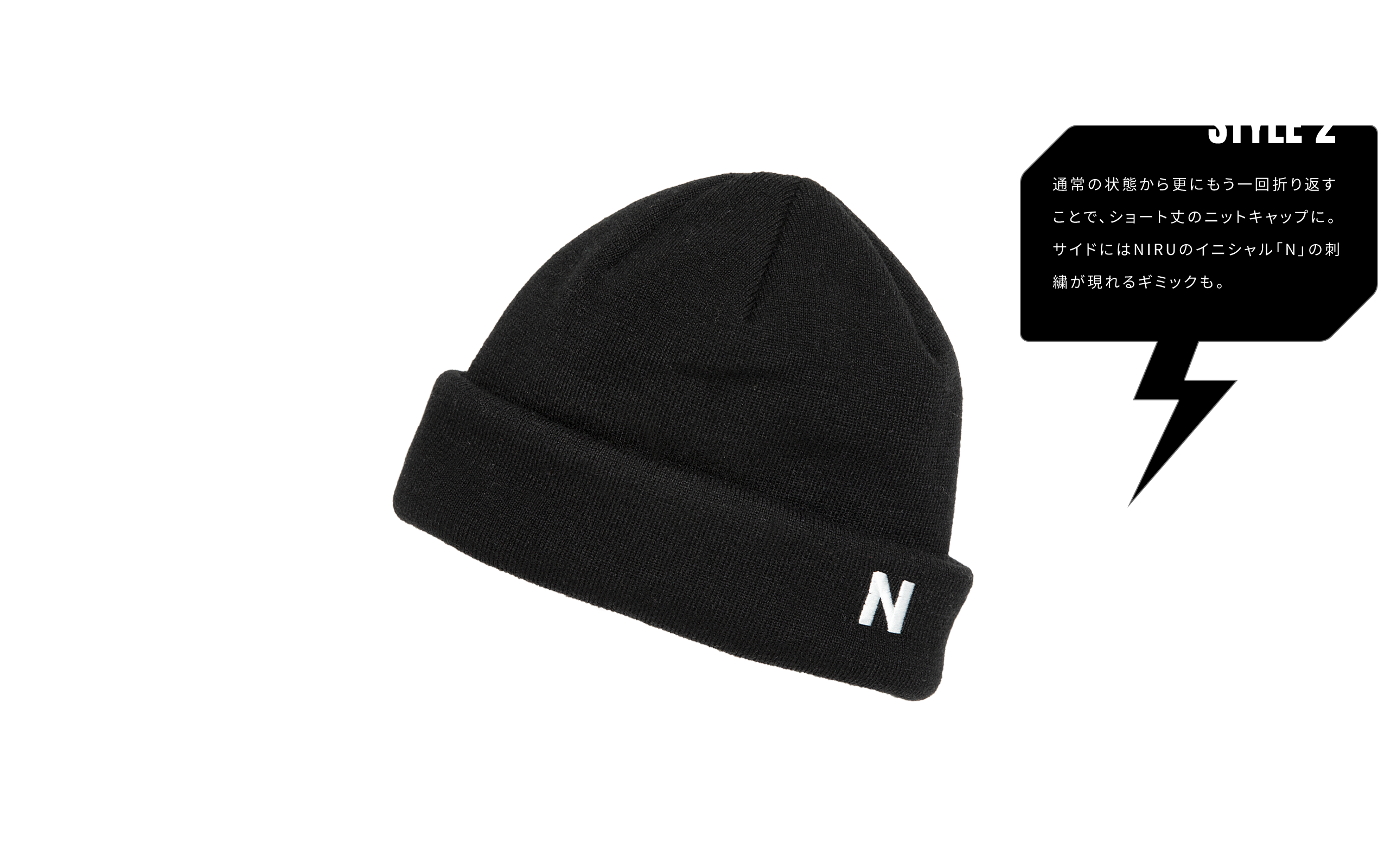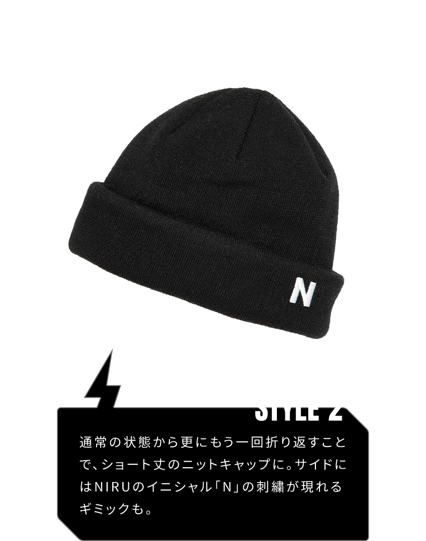 ブラックとホワイトのシンプルなボディに、フェルトのアップリケ刺繍でNIRUのアイコンを立体的にあしらったダブルニットキャップ。アクリルとウールの混合糸を使用したゴム編みで、季節を問わずお使いいただけるアイテムです。