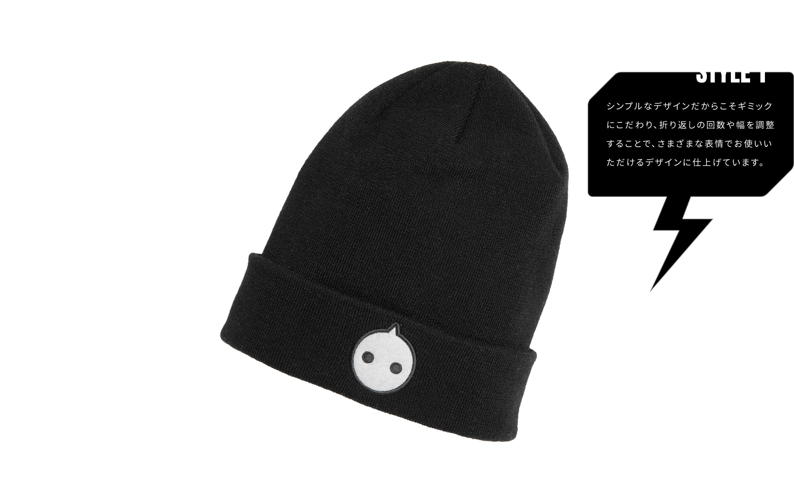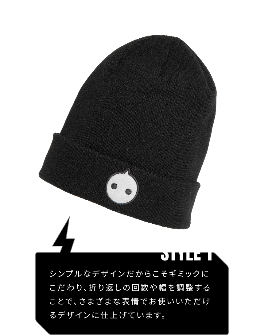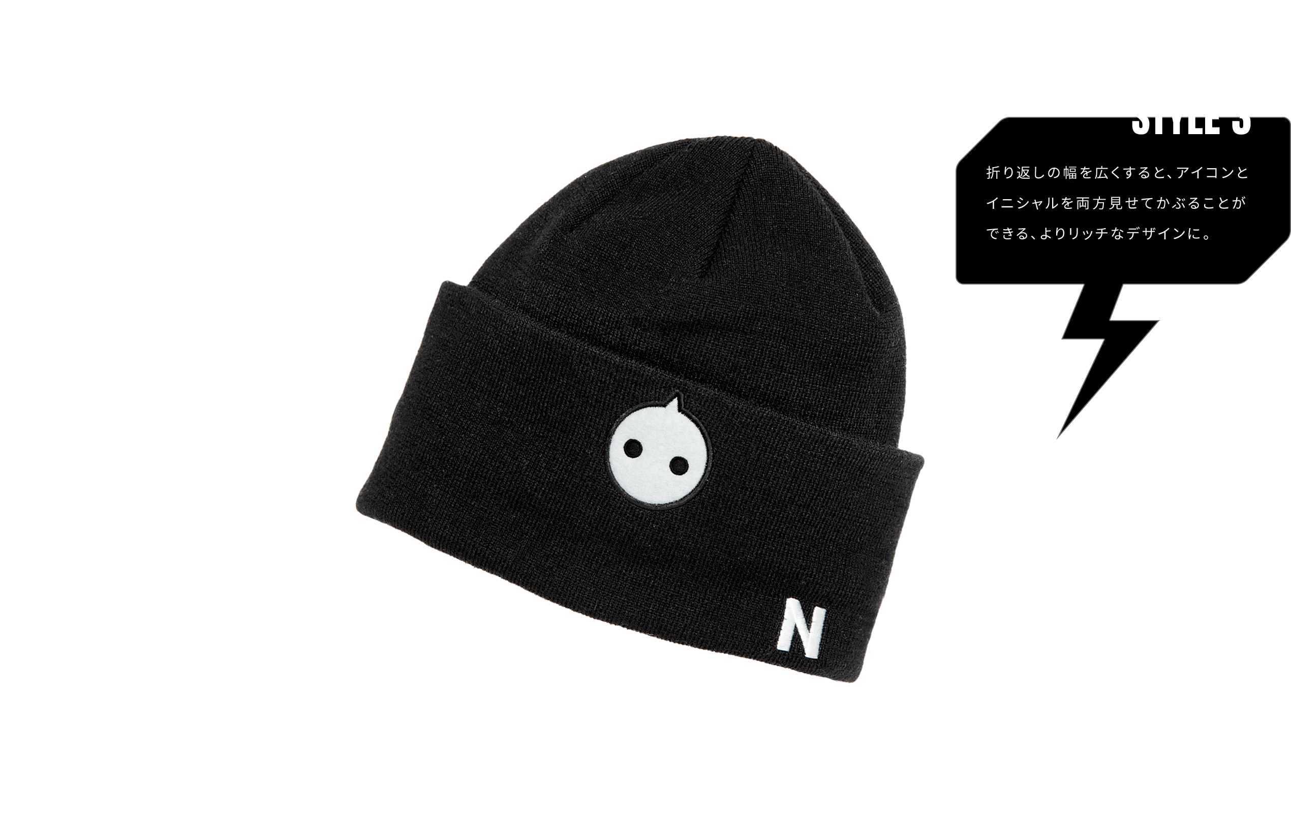 ブラックとホワイトのシンプルなボディに、フェルトのアップリケ刺繍でNIRUのアイコンを立体的にあしらったダブルニットキャップ。アクリルとウールの混合糸を使用したゴム編みで、季節を問わずお使いいただけるアイテムです。